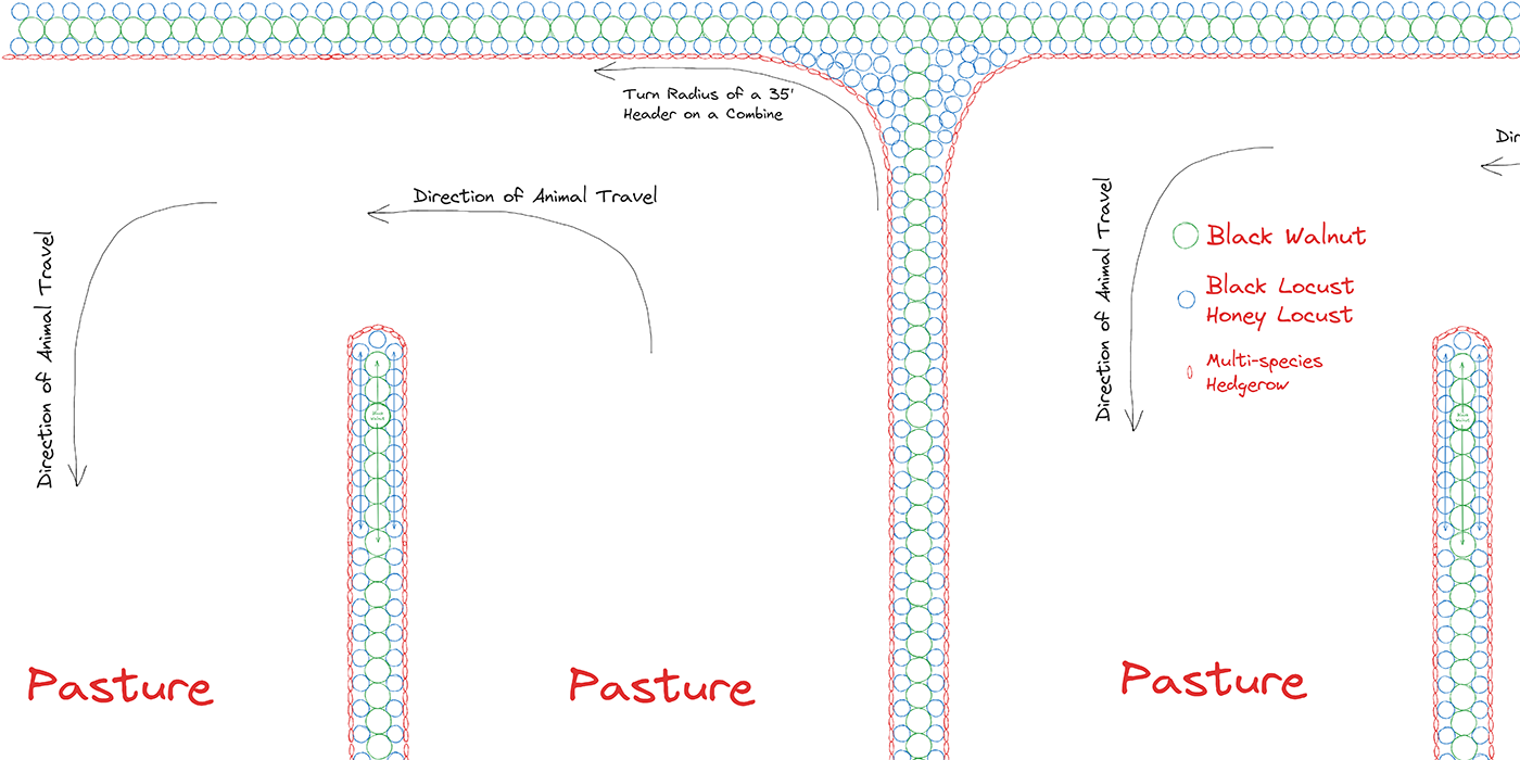 On the outer edges of each of these lanes (and on the interior side of the perimeter trees), hedgerows serve as living fences. Built dense enough to be "hog-tight", they keep grazing animals in their lanes while sheltering wildlife and offering berry and other types of production. Hedgerows also create nesting habitat for birds that help control fly populations around livestock, reversing the ecological emptiness caused by decades of fence-row tree removal in industrial agriculture beginning in the 1970's.