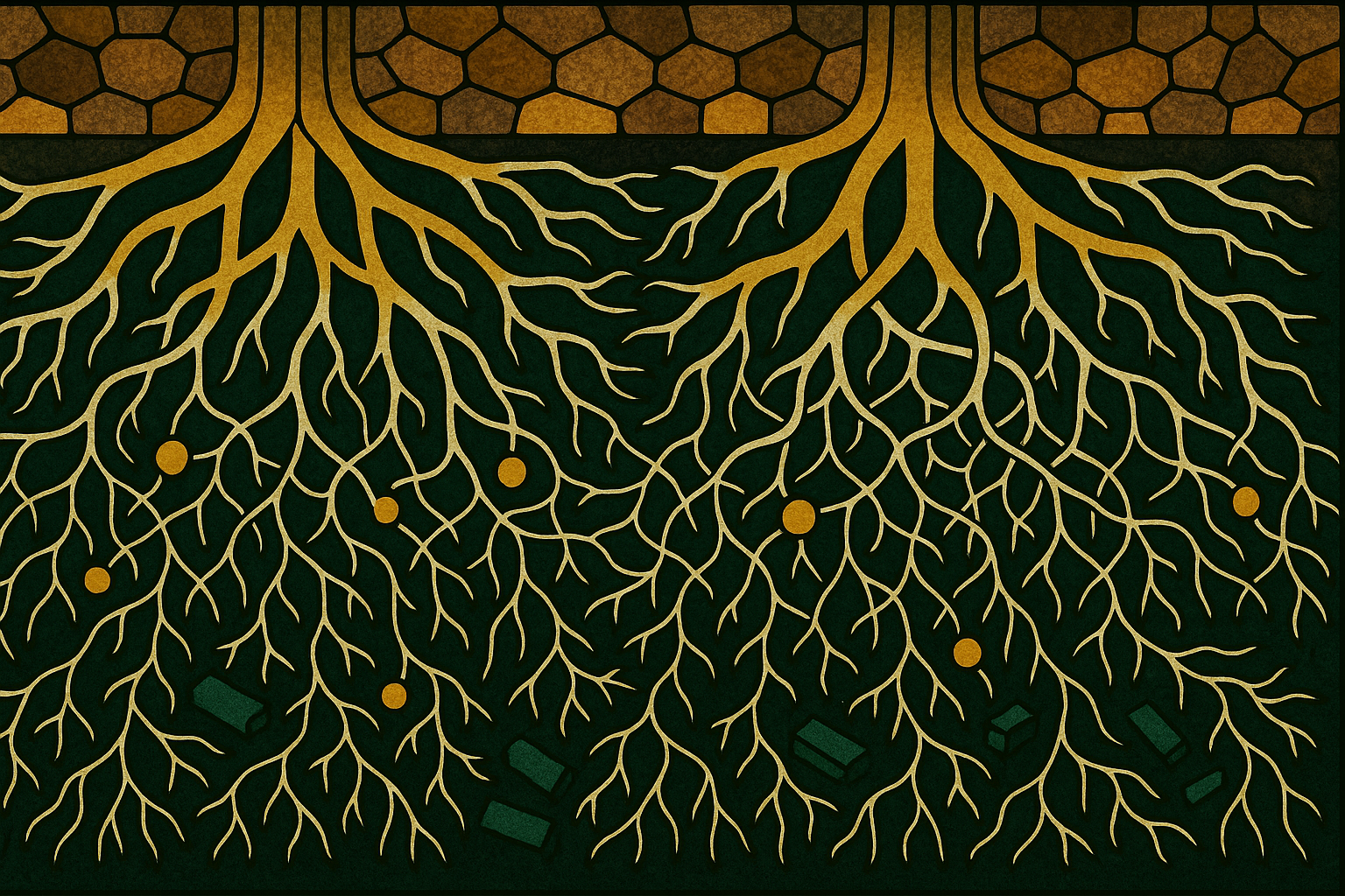 Beneath the soil, a more subtle infrastructure thrives. Each planted tree is inoculated with mycorrhizal fungi, linking the entire system in an underground network that transfers water, nutrients, and chemical signals. Biochar, integrated throughout the lanes, acts as a nutrient and water battery, providing surface area for fungi and bacteria while locking carbon in the soil for centuries. Together, this network functions like a living computer, sensing environmental changes, providing linked chemical communications between the roots of all plants in the system, and routing resources where they are most needed.