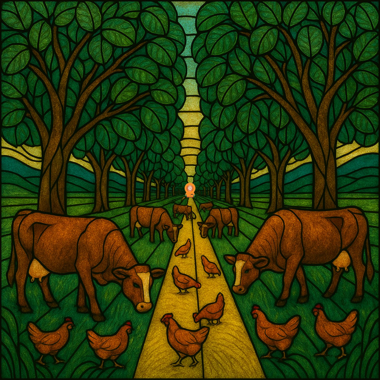 Cathedral grazing lanes support crops or livestock, chickens follow cattle in a fly-killing rhythm, sacred geometry guides layout and movement, locust trees provide fodder, and daily movement builds soil while feeding animals.